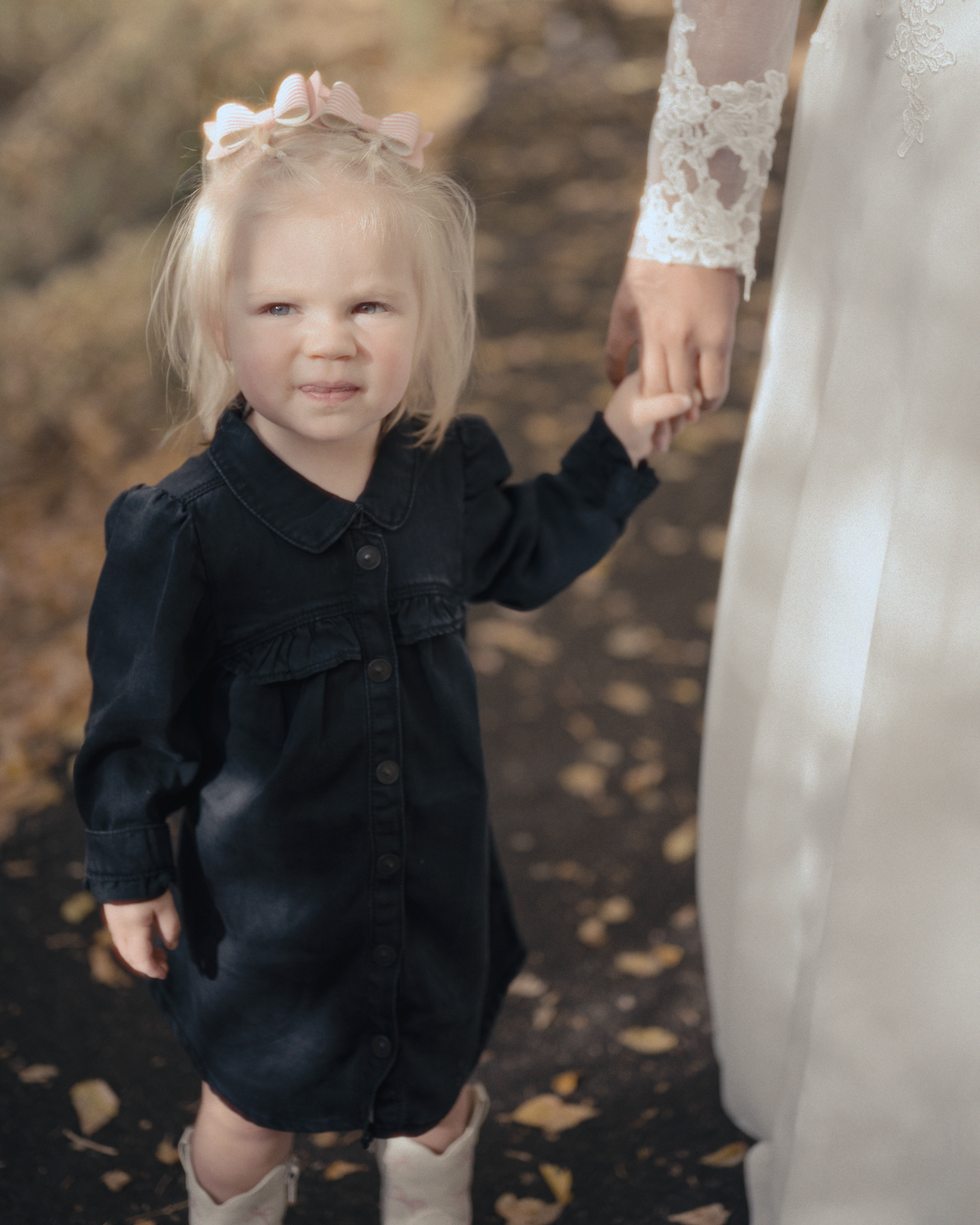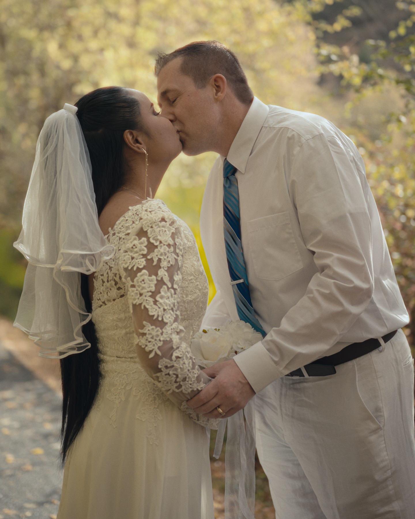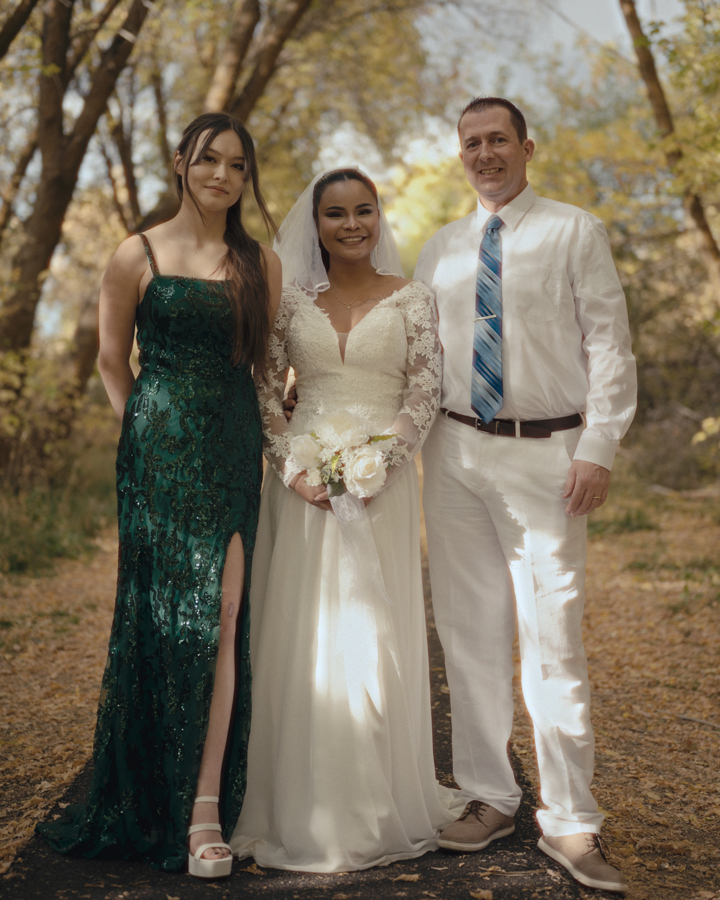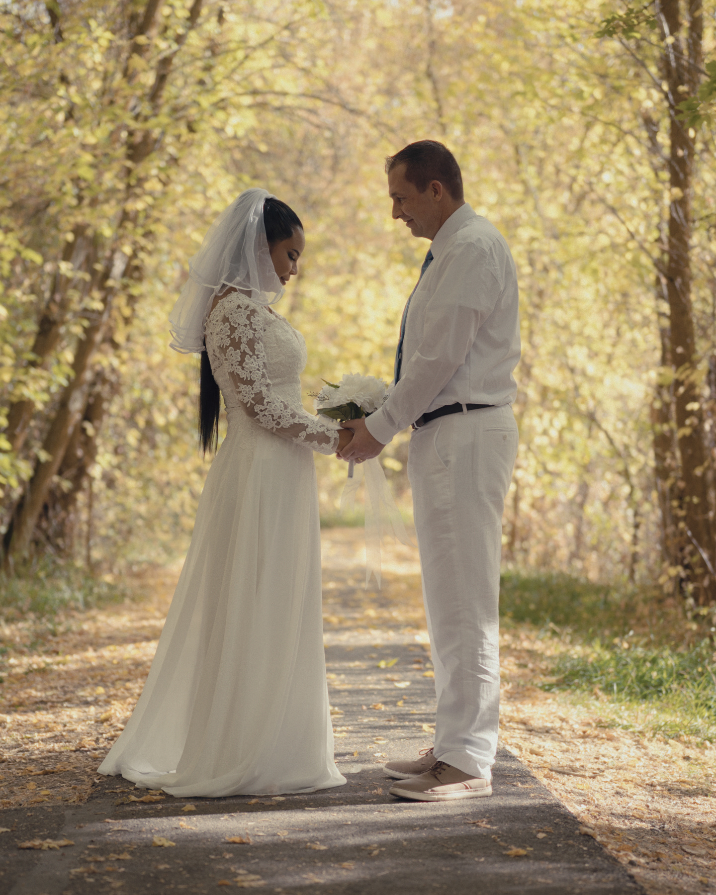 Bride standing among fall trees before her ceremony in Pocatello, Idaho.