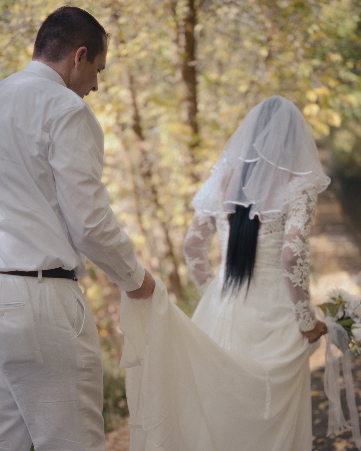 Bride and groom walking through fall trees after their ceremony in Pocatello, Idaho.